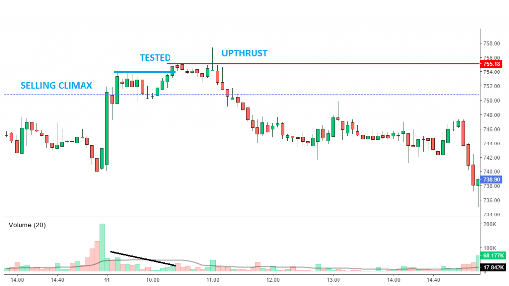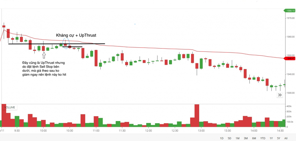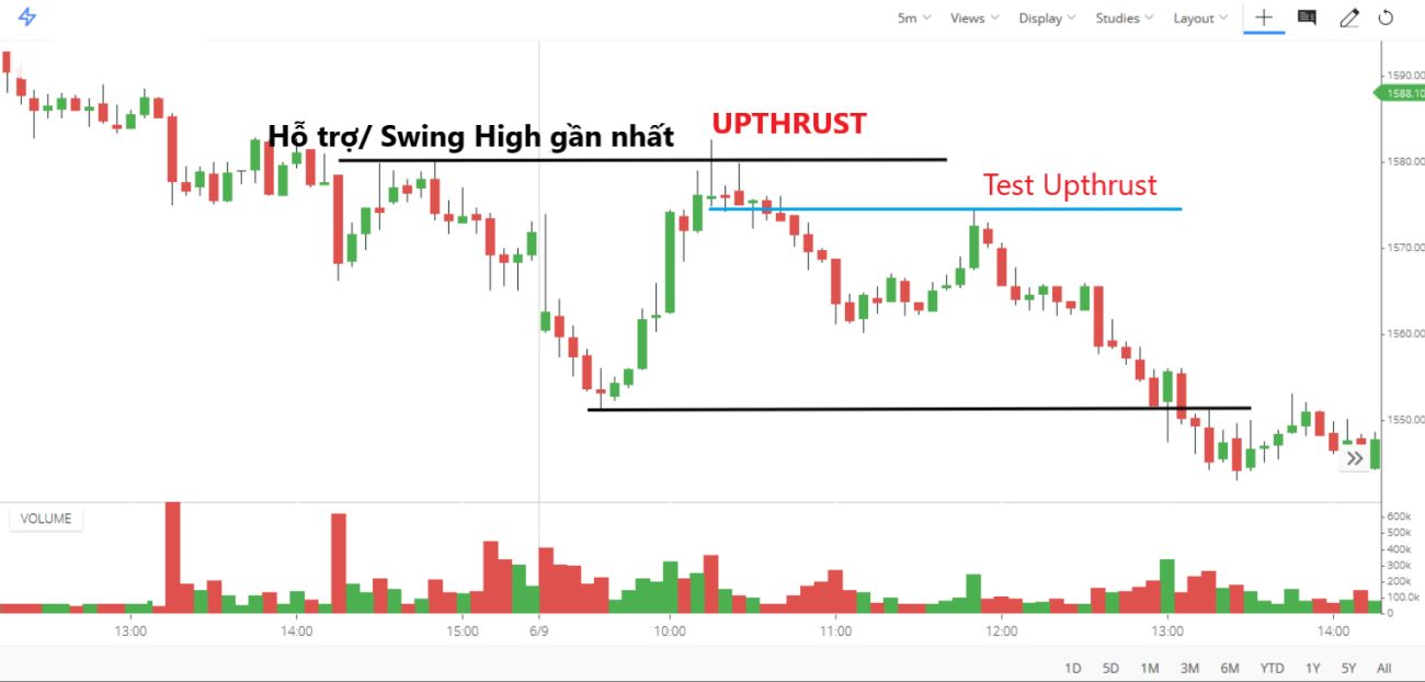 - Điều kiện này tương tự như đối với Spring, thiết lập đáng tin cậy là khi Upthrust đi kèm với khối lượng giao dịch thấp