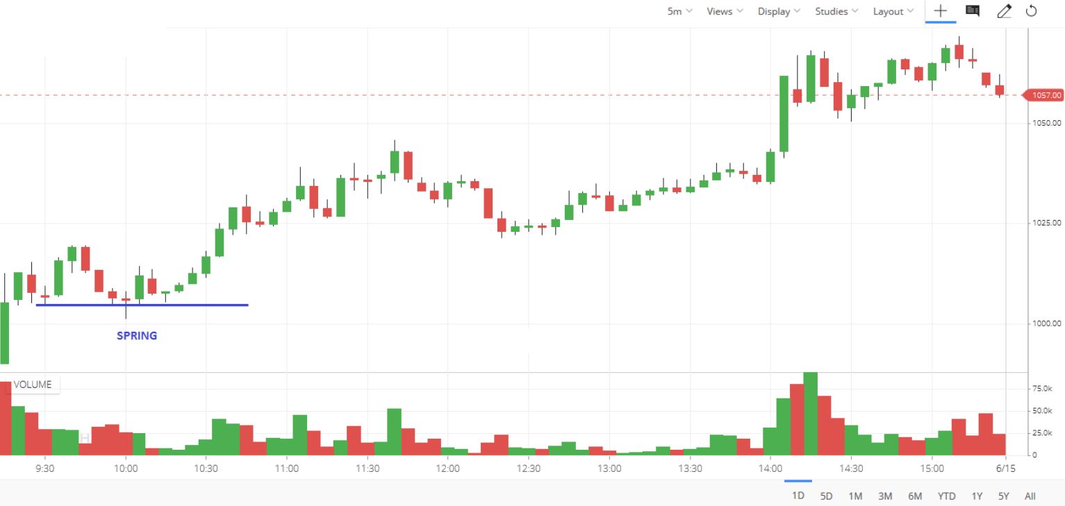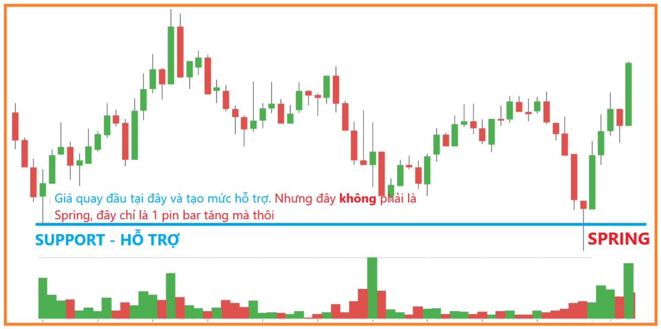 Spring xảy ra khi giá phá vỡ 1 vùng hỗ trợ, nhưng sau đó nhanh chóng đi ngược lên tạo ra một false breakout. Nếu bán ra ngay khi thấy giá phá vỡ hỗ trợ, nhiều trader sẽ bị dính bẫy “bear trap”.