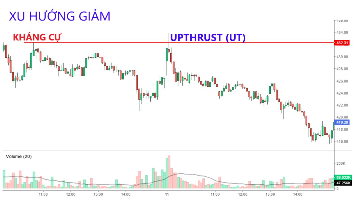 - Nếu Upthrust xuất hiện trong xu hướng giảm, anh em có thể vào lệnh bán. Đặc biệt sẽ đáng tin cậy hơn nếu Upthrust xuất hiện tại kháng cự hoặc các mức Fibonacci
