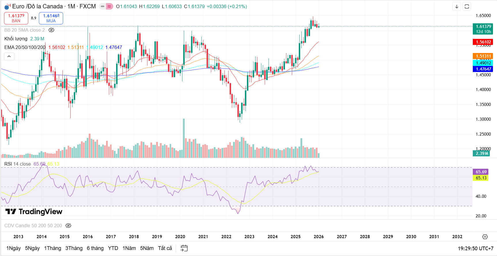 Trên khung tháng, bức tranh tổng thể của EUR/CAD vẫn tích cực. Giá tiếp tục duy trì phía trên toàn bộ hệ thống EMA dài hạn (EMA50 – EMA100 – EMA200), cho thấy xu hướng tăng trung – dài hạn chưa bị phá vỡ. Cấu trúc đáy sau cao hơn đáy trước vẫn được giữ nguyên, phản ánh dòng tiền dài hạn chưa rút khỏi thị trường.
