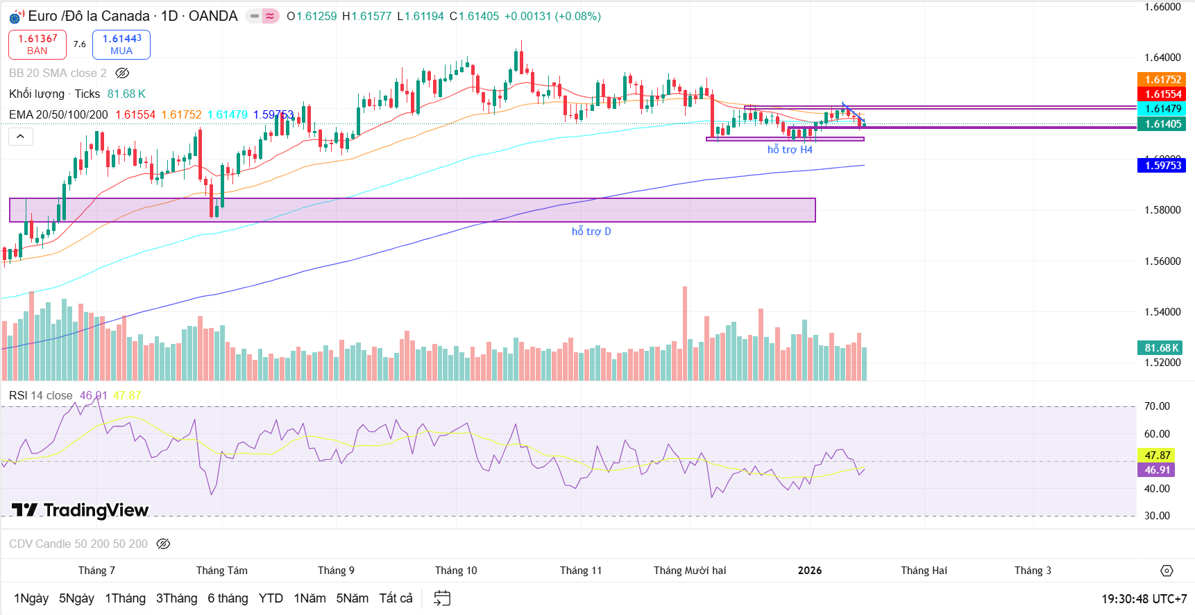 Trong các tuần tới, vùng 1.61 – 1.612 sẽ là khu vực cần theo dõi sát. Nếu vùng này tiếp tục được giữ vững, EUR/CAD có thể hình thành nền tích lũy vững chắc hơn cho một nhịp tăng tiếp theo. Ngược lại, việc phá vỡ dứt khoát xuống dưới vùng hỗ trợ ngày sẽ mở ra kịch bản điều chỉnh sâu hơn về các vùng hỗ trợ thấp hơn trên khung lớn.