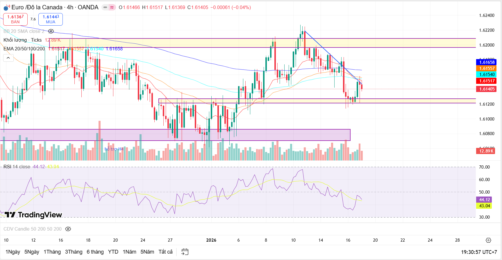 Ở khung H4, xu hướng ngắn hạn thể hiện rõ hơn trạng thái đi ngang – điều chỉnh trong biên. Giá đã phá vỡ nhịp tăng ngắn hạn trước đó và di chuyển trong một range hẹp, với vùng hỗ trợ H4 quanh khu vực 1.61 – 1.612x đang phát huy tác dụng tương đối tốt.