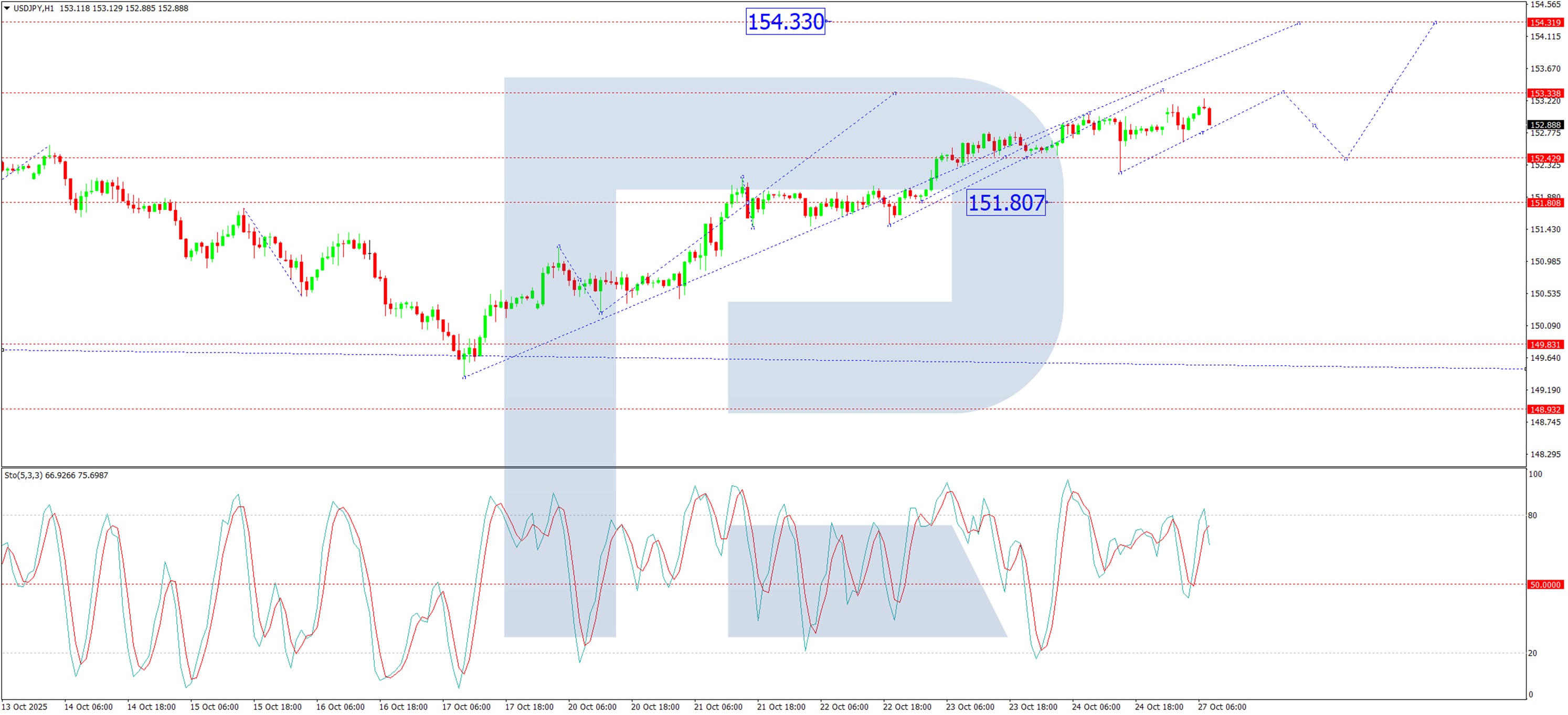 Biểu đồ H1 cho thấy sóng tăng trưởng ban đầu đã hoàn thành tại 153,25. Trọng tâm trước mắt là đà tăng tiếp theo lên 153,33. Khi đạt đến mục tiêu cục bộ này, khả năng sẽ có một đợt điều chỉnh giảm xuống ít nhất 152,43. Khi đợt điều chỉnh này hoàn tất, xu hướng tăng tiếp theo được dự đoán sẽ đưa cặp tiền này về 154,33. Kịch bản này được xác nhận về mặt kỹ thuật bởi chỉ báo dao động Stochastic, với đường tín hiệu nằm trên 50 và có xu hướng mạnh hướng tới 80, cho thấy đà tăng ngắn hạn vẫn còn nguyên vẹn.