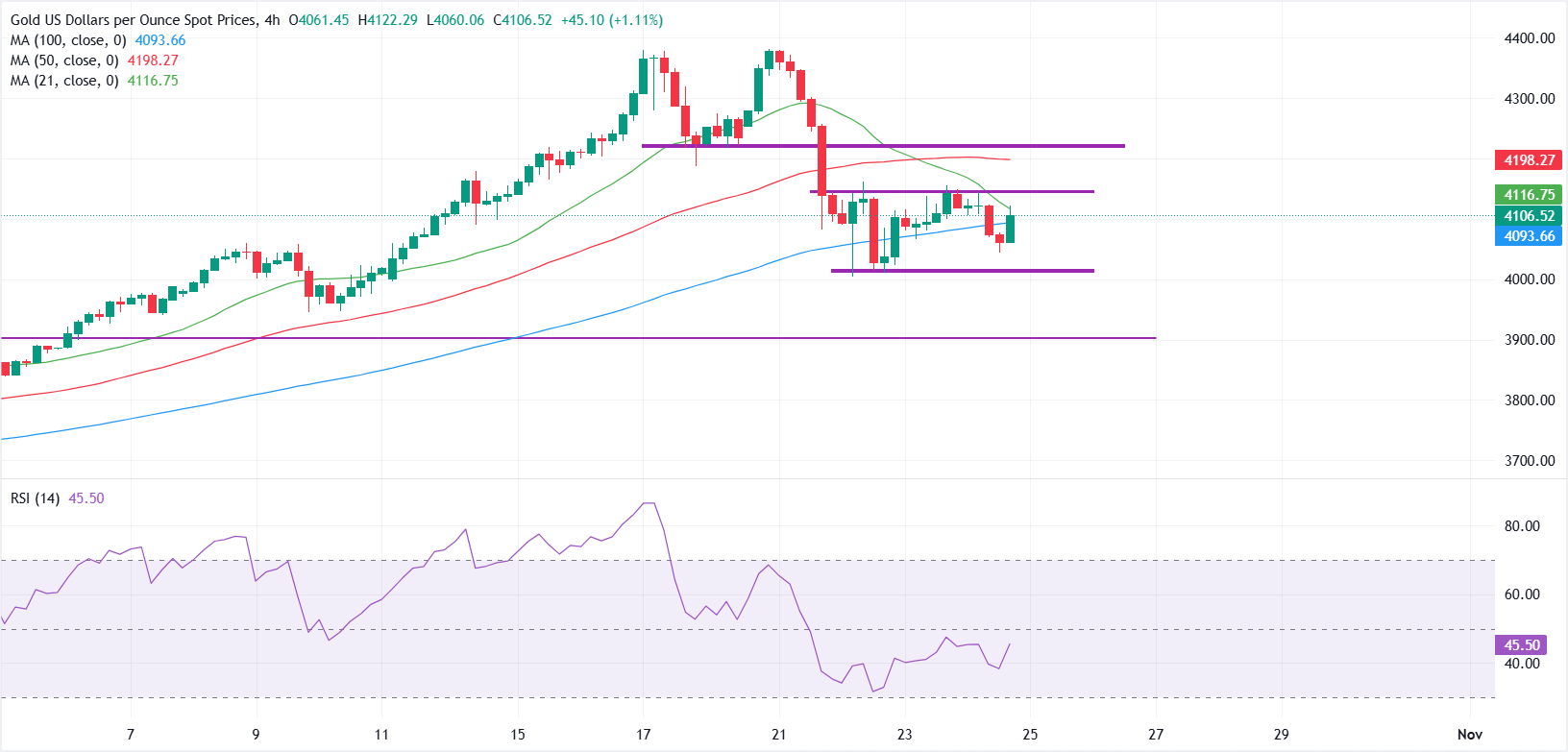Về mặt tích cực, đường SMA 100 gần $4.090 đóng vai trò là ngưỡng kháng cự ngay lập tức, tiếp theo là $4.150. Một động thái duy trì trên vùng này sẽ mở đường cho mức $4.200, nơi áp lực bán mạnh hơn có thể xuất hiện trừ khi phe mua đột phá thành công.