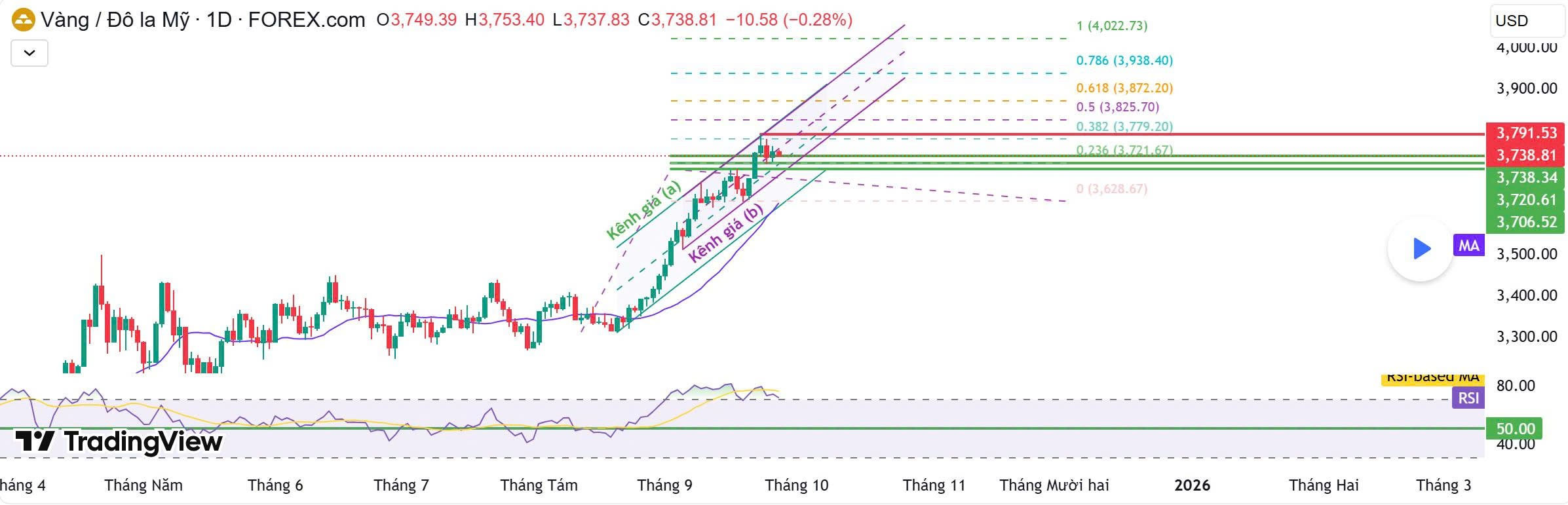 Ngắn hạn: Vàng có dấu hiệu điều chỉnh kỹ thuật quanh vùng kháng cự 3,790 – 3,800 USD/oz. Đây là vùng cản quan trọng trước khi có thể hướng tới các mốc cao hơn như 3,872 và 3,938 USD (mức Fibonacci 0.618 và 0.786).