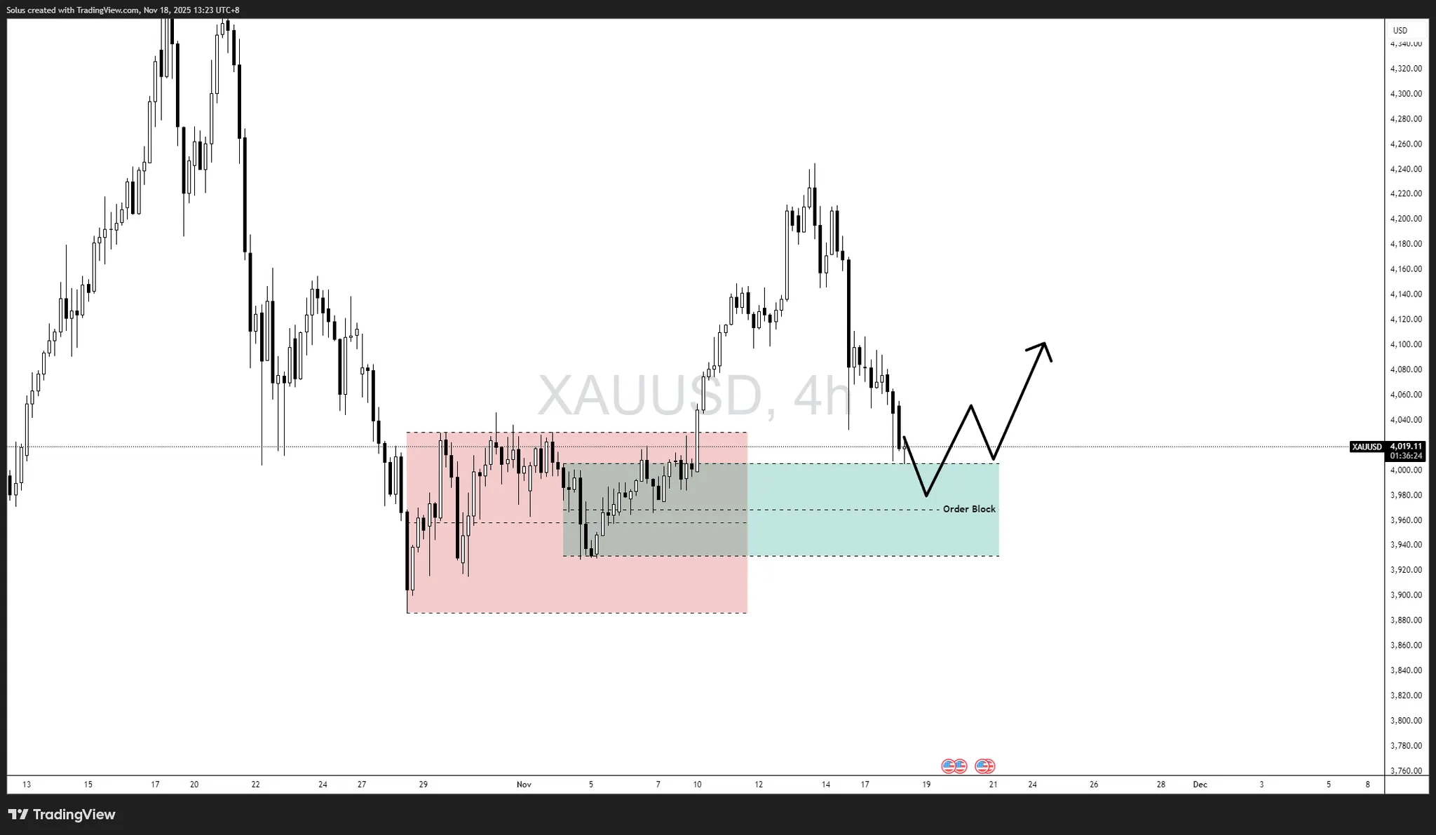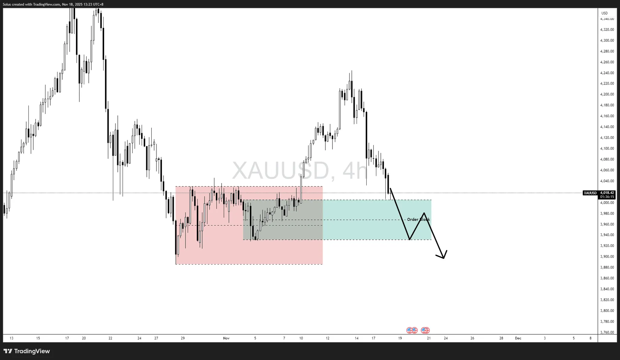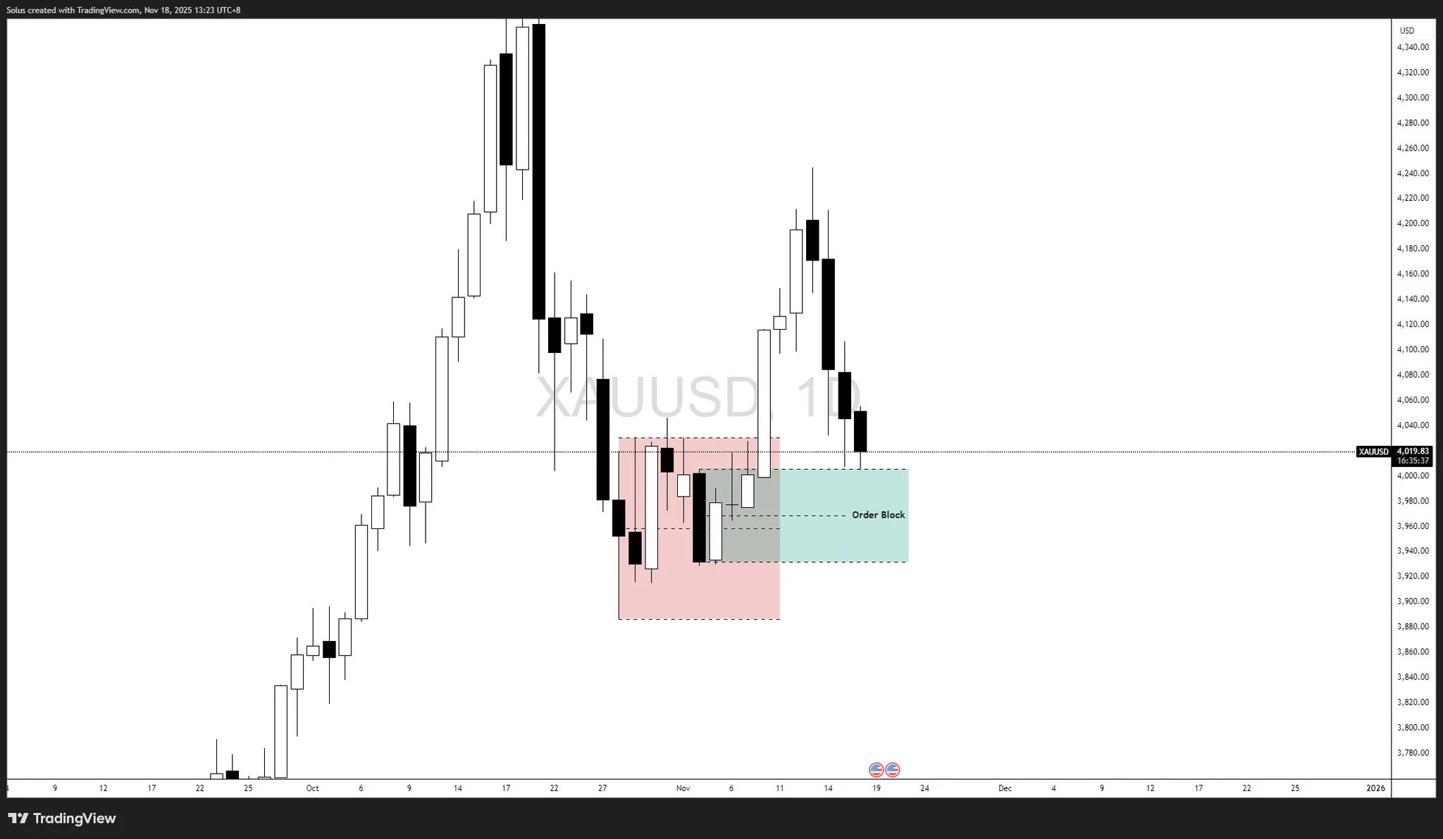 Nếu lợi suất thực tế tiếp tục tăng và USD duy trì sức mạnh trong ngắn hạn, vàng có khả năng phá vỡ ngưỡng hỗ trợ OB và bước vào đợt điều chỉnh kéo dài nhiều ngày.