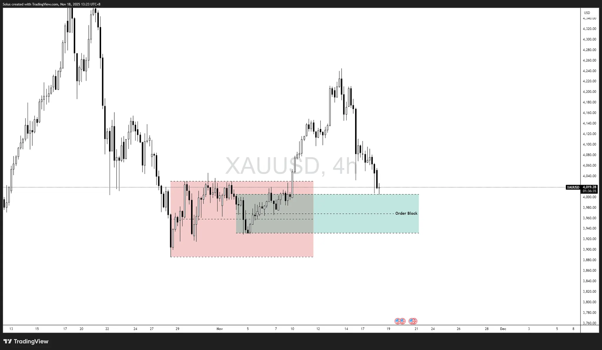 Vàng hiện đã giảm mạnh từ vùng 4.160 đô la, trượt thẳng vào Khối lệnh H4 (OB) chính giữa mức 3.960 đô la–3.900 đô la một trong những vùng nhu cầu quan trọng nhất trên biểu đồ.