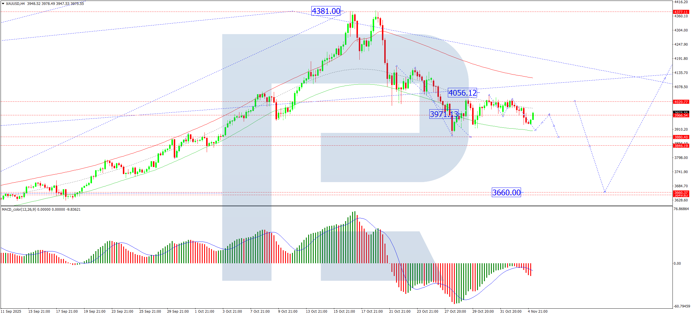 Trên biểu đồ H4, XAU/USD đang hình thành một vùng tích lũy quanh mức 3.970 USD. Việc phá vỡ vùng này dự kiến sẽ kích hoạt một đợt giảm về 3.880 USD, có khả năng tiếp theo là một đợt điều chỉnh phục hồi lên 4.020 USD (kiểm tra mức phá vỡ từ bên dưới). Áp lực bán tiếp tục tăng có thể đẩy cặp tiền này về mức 3.660 USD, nơi đợt điều chỉnh hiện tại có thể kết thúc, tạo tiền đề cho một làn sóng tăng mới hướng tới 4.400 USD. Chỉ báo MACD ủng hộ quan điểm giảm giá ngắn hạn này, với đường tín hiệu nằm dưới mức 0 và hướng xuống, xác nhận đà điều chỉnh đang diễn ra.