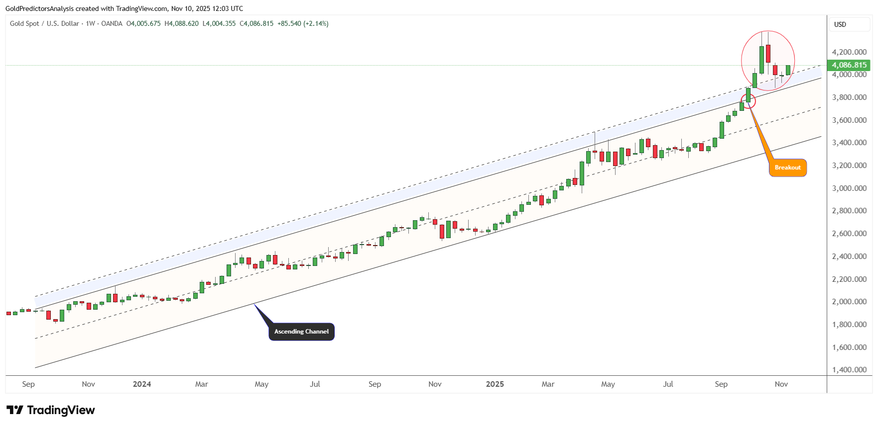 Vàng gần đây đã vượt qua ranh giới trên của kênh, báo hiệu một sự thay đổi kỹ thuật quan trọng. Sự bứt phá này đã đẩy giá lên trên mức 4.000 đô la, đánh dấu sự khởi đầu của một giai đoạn tăng giá mạnh mẽ hơn. Nến bứt phá cho thấy khối lượng và động lượng mạnh mẽ, xác nhận niềm tin đằng sau động thái này.