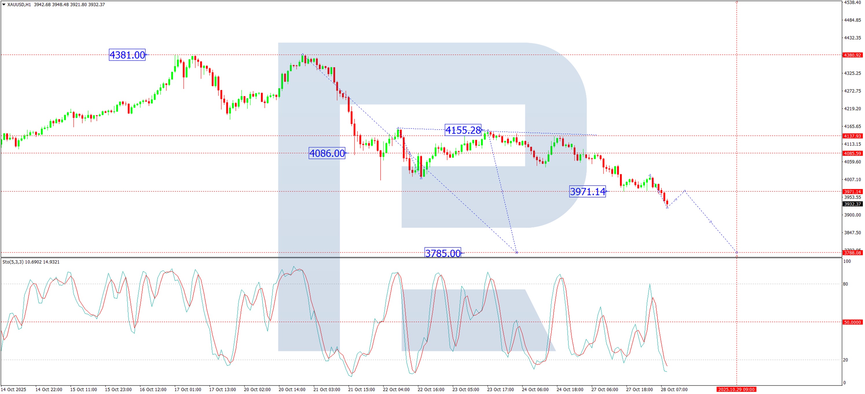 Trên biểu đồ H1, cặp tiền đang hình thành cấu trúc giảm hướng đến 3.785 USD. Một vùng tích lũy đã hình thành quanh mức 3.971 USD; việc phá vỡ dưới mức này sẽ báo hiệu sự tiếp tục giảm hướng đến mục tiêu đã đề ra. Chỉ báo dao động Stochastic Oscillator xác nhận đà tăng này, với đường tín hiệu nằm dưới mức 50 và có xu hướng giảm hướng đến 20, phản ánh áp lực bán đang gia tăng.