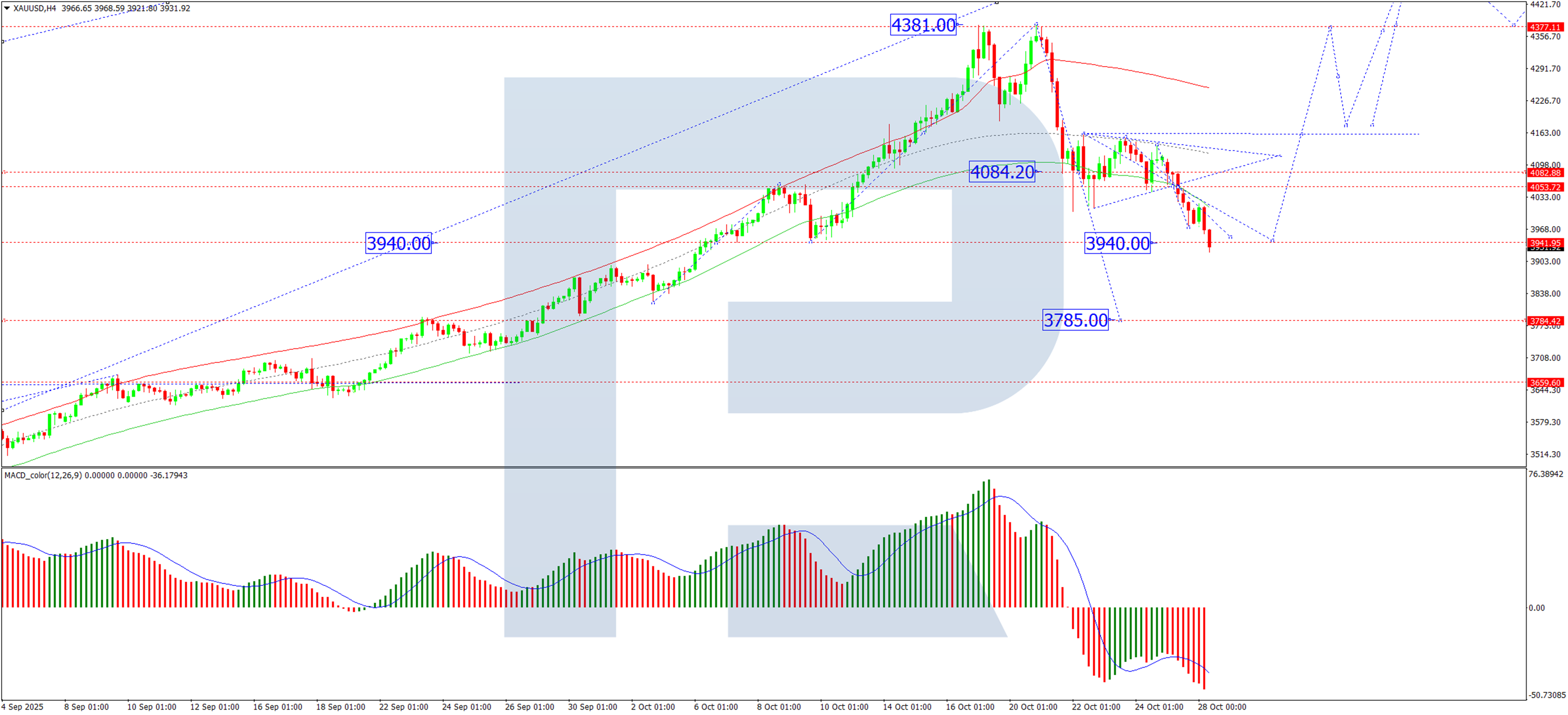 Trên biểu đồ H4, XAU/USD đã hình thành một vùng tích lũy quanh mức 4.085 USD trước khi đột ngột giảm mạnh. Thị trường dường như đang hình thành nhịp sóng thứ hai của đợt sóng giảm này, với mục tiêu tiếp theo được dự đoán là 3.785 USD. Triển vọng giảm giá ngắn hạn này được hỗ trợ bởi chỉ báo MACD. Đường tín hiệu của nó đang hướng xuống và biểu đồ histogram đã di chuyển vào vùng âm, cho thấy giai đoạn điều chỉnh vẫn chưa hoàn tất.