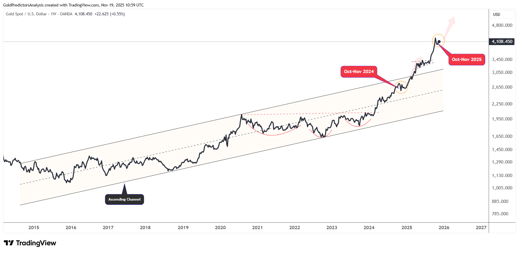 Biểu đồ vàng bên dưới cho thấy một sự bứt phá quyết định từ một kênh tăng dần được xác định rõ ràng. Biến động giá di chuyển đều đặn trong cấu trúc này, hình thành một mô hình nhất quán với các đỉnh cao hơn và đáy cao hơn. Kênh này đã tạo ra một nền tảng kỹ thuật vững chắc cho xu hướng tăng dài hạn của vàng, giữ vững qua các giai đoạn biến động. Sự bứt phá cuối cùng của nó báo hiệu một sự thay đổi về động lượng và tiềm năng cho một giai đoạn tăng trưởng mạnh hơn.