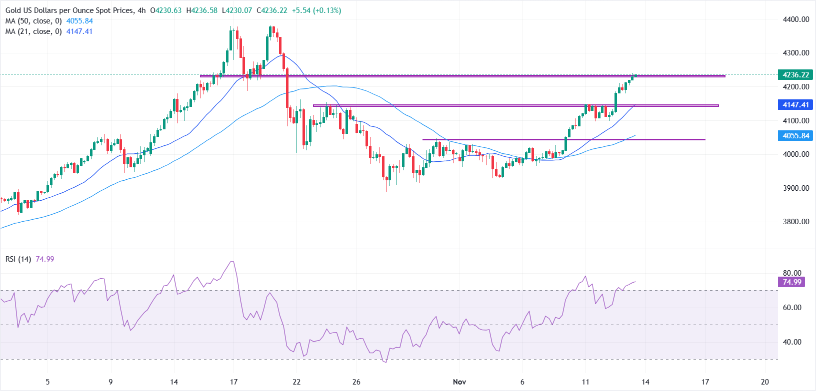 XAU/USD đã tiếp tục xu hướng tăng hiện tại trên biểu đồ 4 giờ sau một giai đoạn tích lũy lành mạnh và một đợt điều chỉnh ngắn. Kim loại quý này hiện đang kiểm tra vùng kháng cự quan trọng tại 4.230-4.250 đô la, đánh dấu vùng phá vỡ trước đó. Một sự bứt phá quyết định trên vùng này sẽ mở ra cơ hội cho việc kiểm tra lại mức cao nhất mọi thời đại gần 4.381 đô la và có khả năng thiết lập vùng kỷ lục mới sau đó.