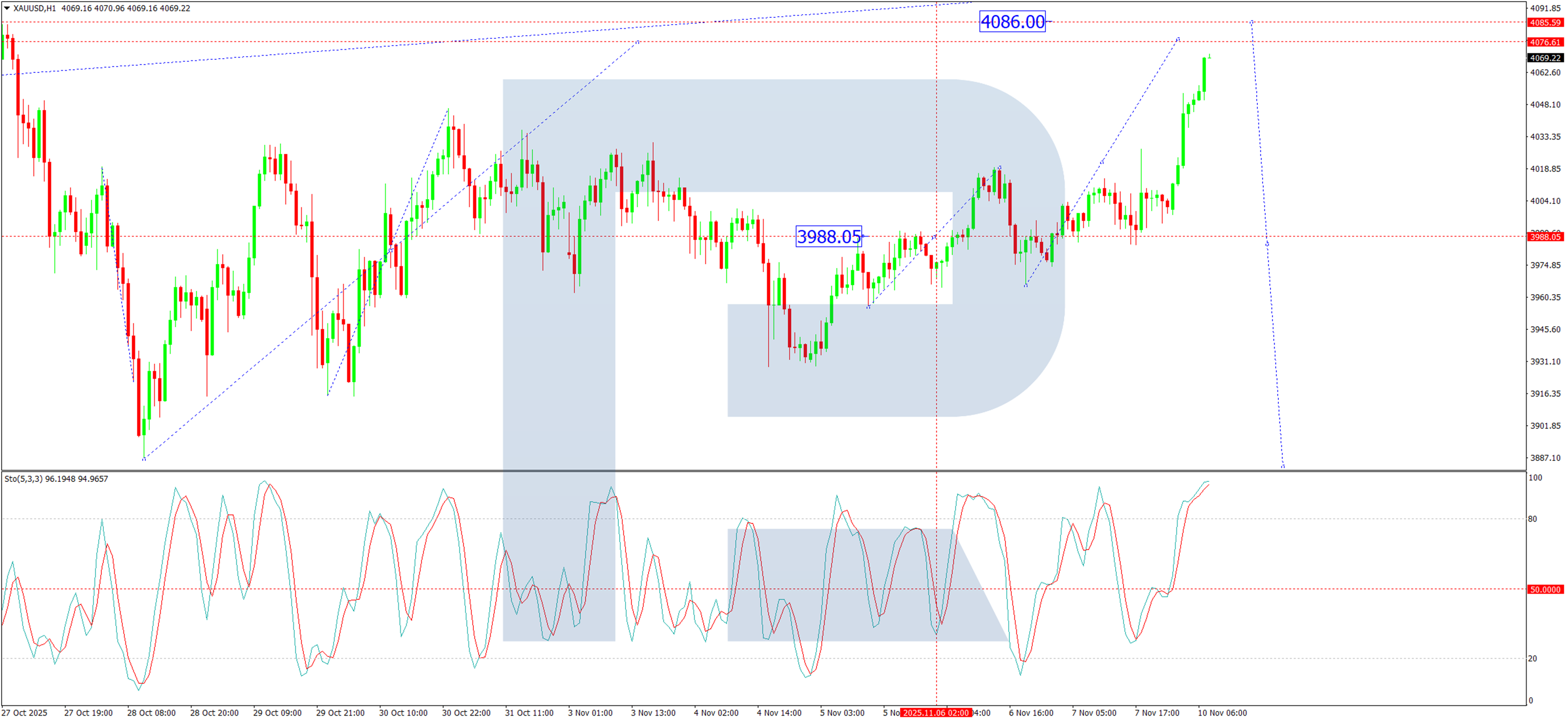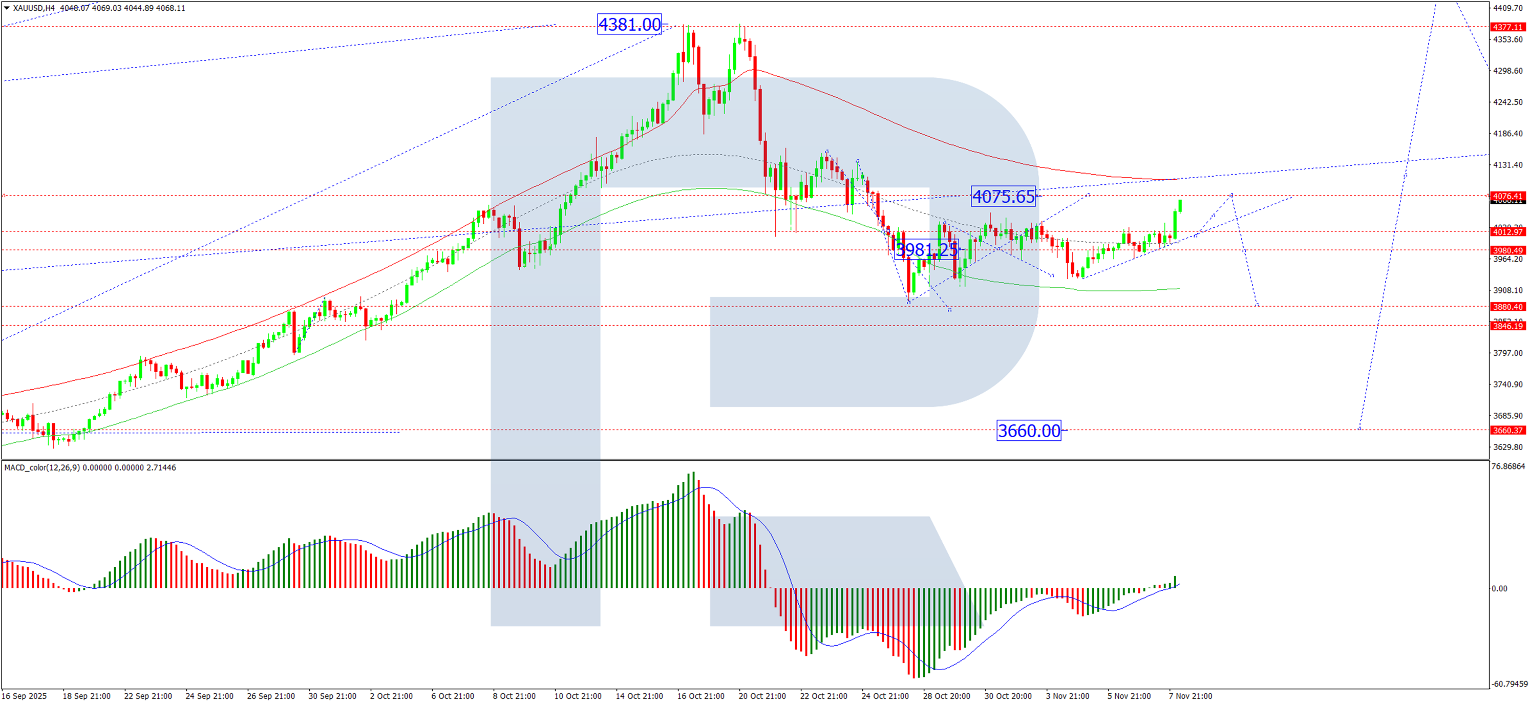 Trên biểu đồ H4, XAU/USD đang hình thành một vùng tích lũy quanh mức 3.988 USD. Một cú bứt phá theo hướng tăng dự kiến sẽ khởi đầu một làn sóng tăng trưởng hướng tới 4.075 USD, sau đó có thể giảm xuống 4.020 USD (kiểm tra mức này từ bên dưới). Một cú phá vỡ tiếp theo từ vùng này có thể mở rộng đợt điều chỉnh về 3.660 USD, nơi xu hướng giảm dự kiến sẽ kết thúc. Điều này có khả năng tạo tiền đề cho một làn sóng tăng mới nhắm tới 4.400 USD. Chỉ báo MACD hỗ trợ triển vọng này , với đường tín hiệu nằm trên mức 0 và hướng lên trên, cho thấy đà tăng giá ngắn hạn vẫn tiếp tục.