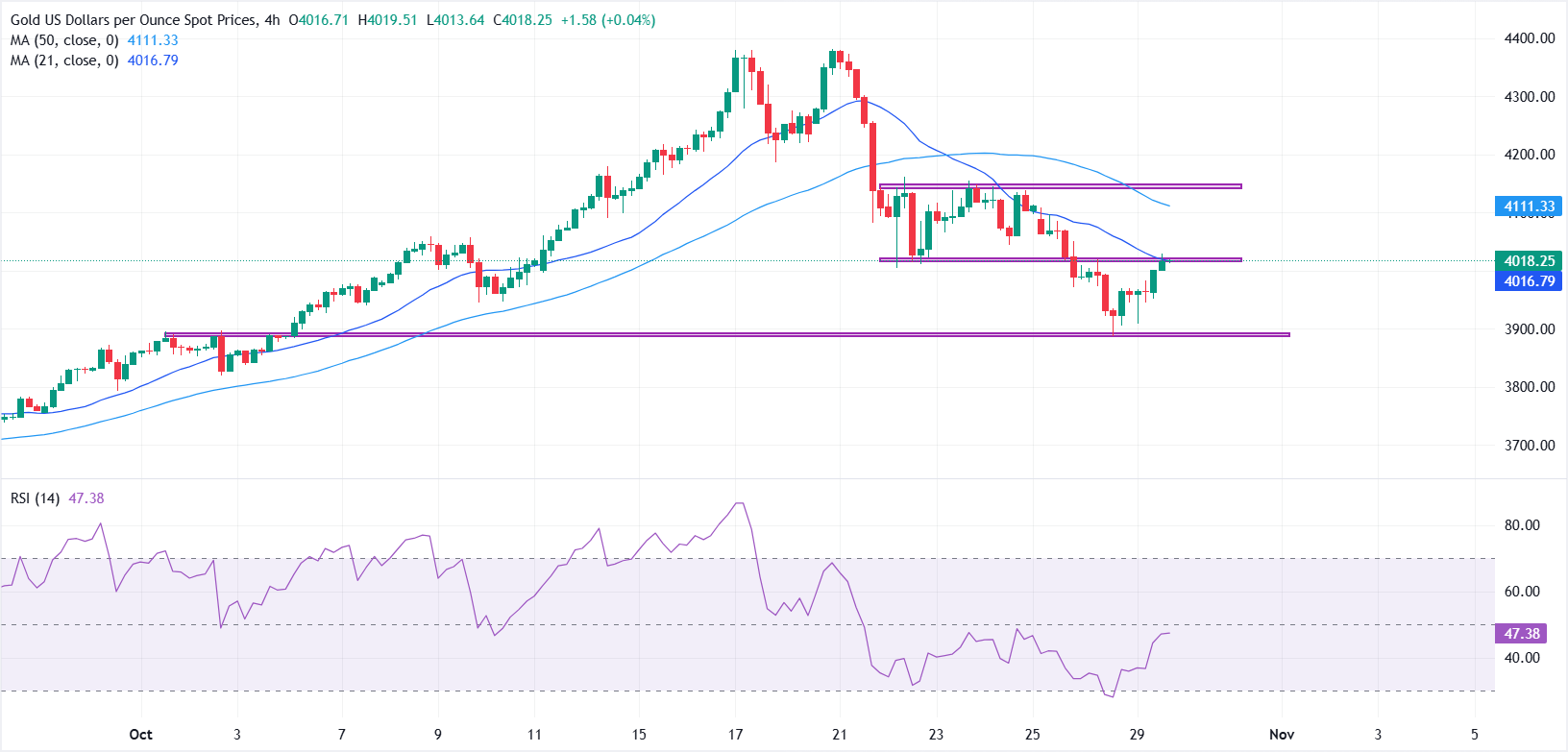 XAU/USD đang cố gắng ổn định trên mức 4.000 đô la, nhưng đà phục hồi vẫn còn mong manh. Trên biểu đồ 4 giờ, ngưỡng kháng cự hiện tại nằm ở vùng 4.020–4.050 đô la, một vùng hỗ trợ trước đây hiện được củng cố bởi đường trung bình động đơn giản (SMA) 21 kỳ. Một sự bứt phá quyết định trên vùng này có thể mở ra cánh cửa hướng tới ngưỡng kháng cự tiếp theo ở mức 4.100–4.150 đô la, trùng khớp với đường SMA 50 kỳ.