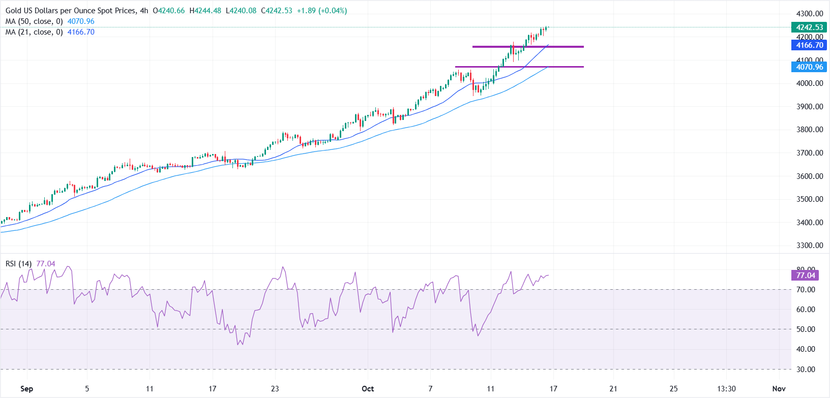 Hỗ trợ tức thời được nhìn thấy quanh mức 4.200 đô la, đánh dấu mức thấp trong ngày, tiếp theo là vùng 4.150-4.160 đô la, trùng với đường SMA 21 kỳ trên biểu đồ 4 giờ. Khả năng giá giảm sâu hơn về đường SMA 50 kỳ gần 4.065 đô la dường như không có trong ngắn hạn do động lực và sức mạnh xu hướng tiếp tục ủng hộ hoạt động mua vào khi giá giảm.