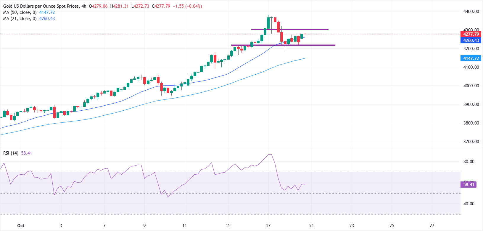 XAU/USD) ổn định sau đợt giảm mạnh từ mức cao kỷ lục vào thứ Sáu, cho thấy khả năng đạt đỉnh ngắn hạn gần mức cao nhất mọi thời đại khoảng 4.380 đô la. Trên biểu đồ 4 giờ, giá giao ngay đang dao động trên đường trung bình động đơn giản (SMA) 21 kỳ ở mức 4.256 đô la.