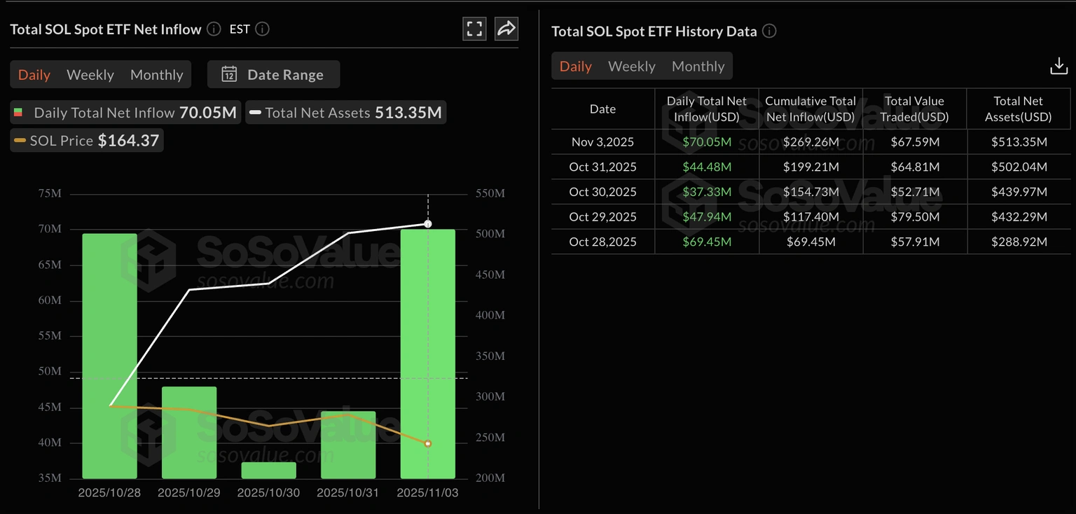 Giá Solana giảm gần 1% vào thời điểm viết bài hôm thứ Ba, kéo dài chuỗi giảm 11% từ thứ Hai. Mặc dù các quỹ giao dịch hoán đổi (ETF) Solana giao ngay tại Mỹ đã ghi nhận dòng vốn đổ vào 70,05 triệu đô la vào thứ Hai, đánh dấu ngày giao dịch tích cực cao nhất và thứ tư liên tiếp.