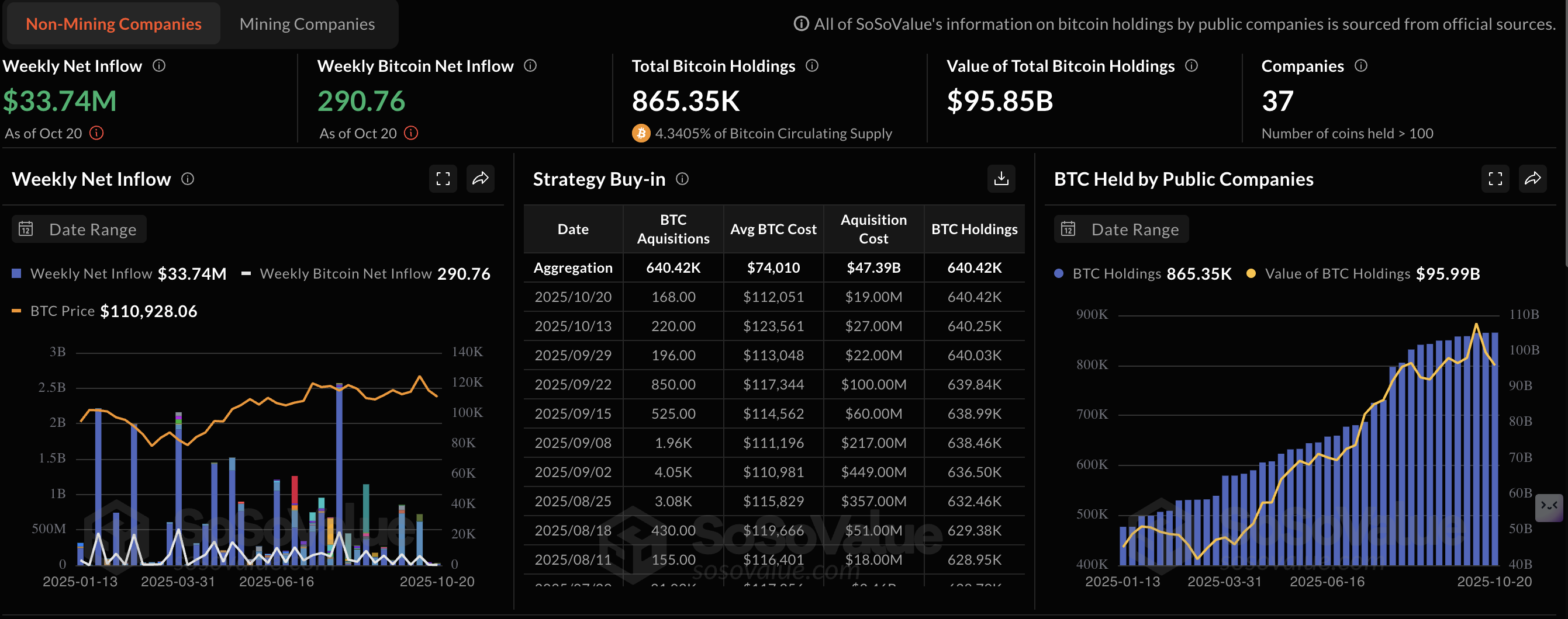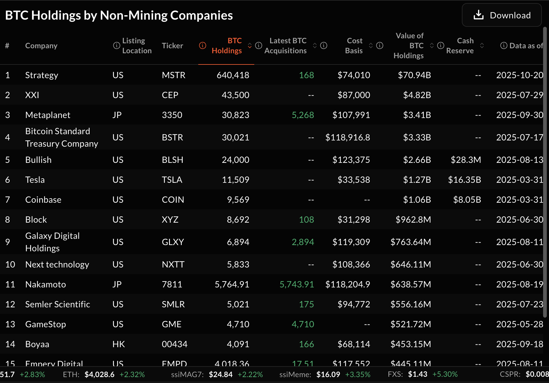 Có 37 công ty khai thác không phải BTC đang vận hành kho bạc BTC do Michael Saylor's Strategy dẫn đầu, với tổng số 640.418 BTC trong bảng cân đối kế toán, trị giá 70,94 tỷ đô la và được mua lại với giá gốc là 74.010 đô la. Công ty kho bạc Bitcoin lớn thứ hai là XXI, với 43.500 BTC trị giá khoảng 4,82 tỷ đô la với giá gốc là 87.000 đô la, tiếp theo là MetaPlanet, với 30.823 BTC trị giá 3,41 tỷ đô la và được mua lại với giá gốc trung bình là 107.991 đô la.