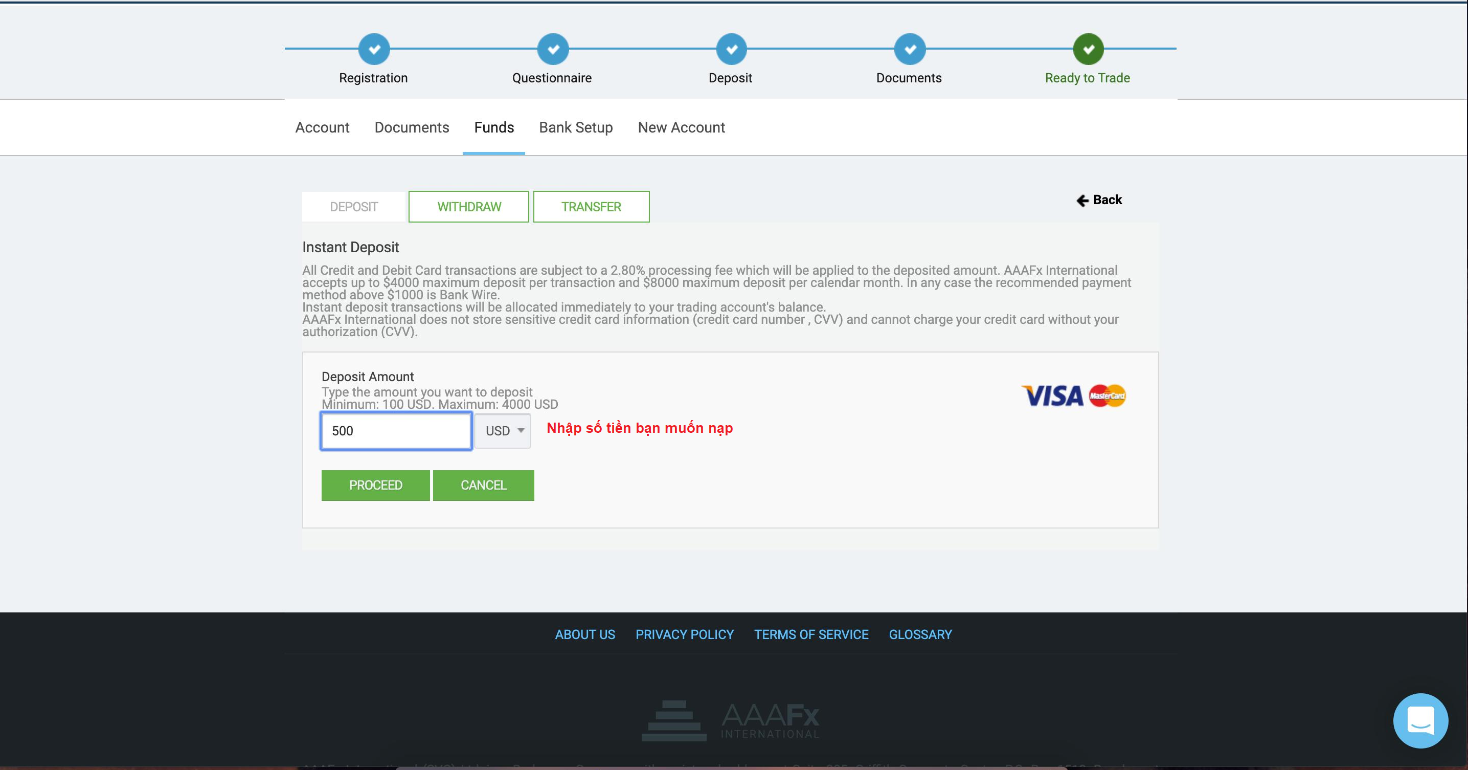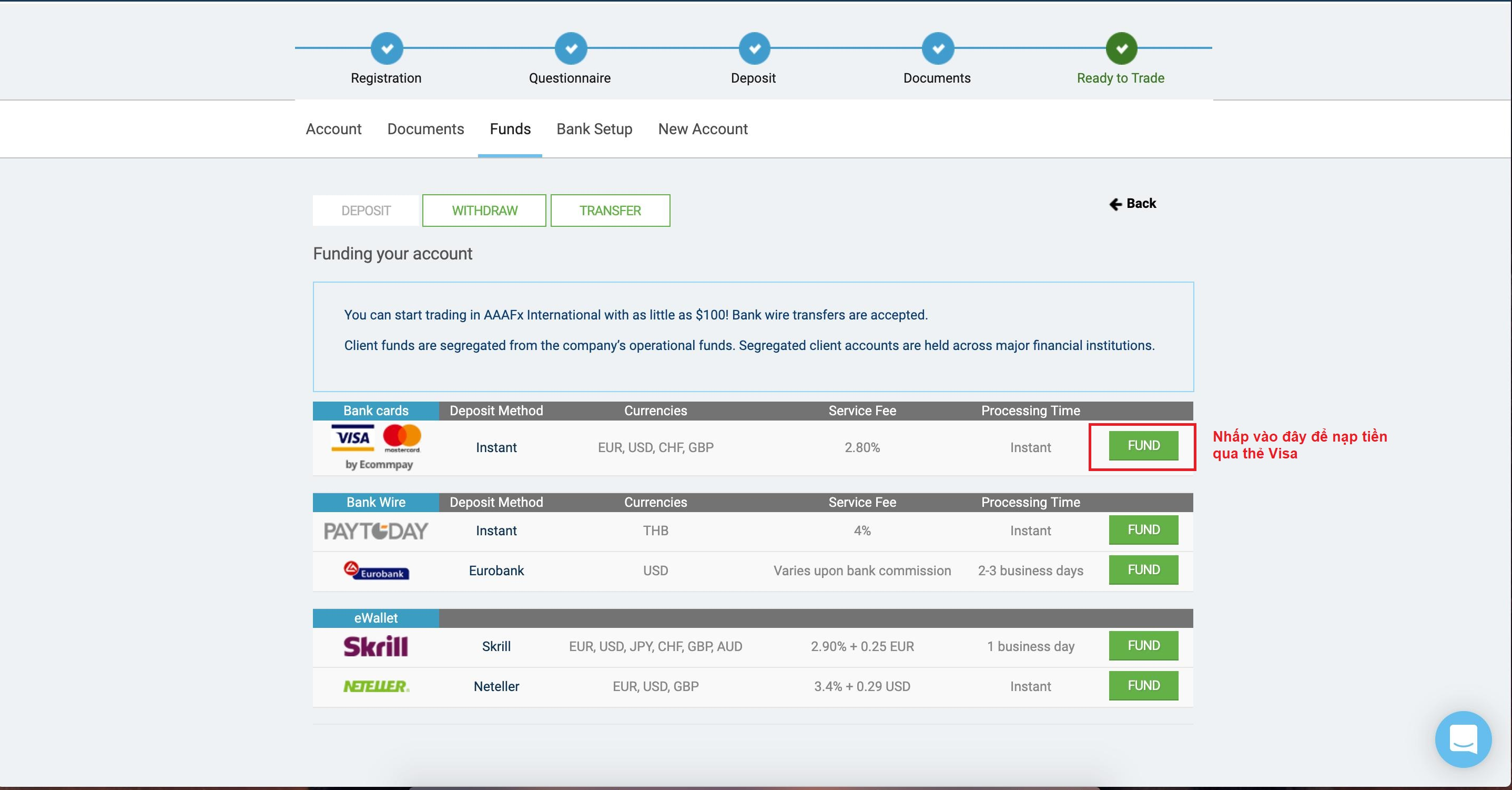 Lưu ý: Số tiền nạp tối thiểu tại AAAFx là 300USD