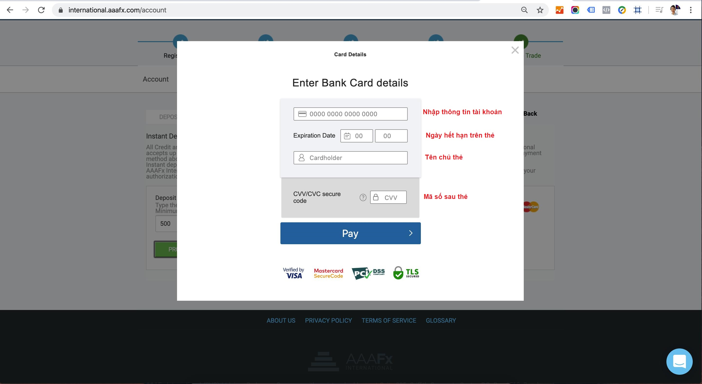 Bạn tiến hành điền các thông tin cần thiết vào mục yêu cầu. Sau khi hoàn tất đúng thông tin như trên thẻ , bạn nhấn nút PAY để tiến hành thanh toán. Vậy là bạn đã hoàn thành các bước nạp tiền tại AAAFx, sau đó tại hệ thống Zulutrade sẽ tự động cập nhật tương ứng số tiền bạn nạp. Bạn có thể kiểm tra lại bằng cách đăng nhập lại tại hệ thống Zulutrade.