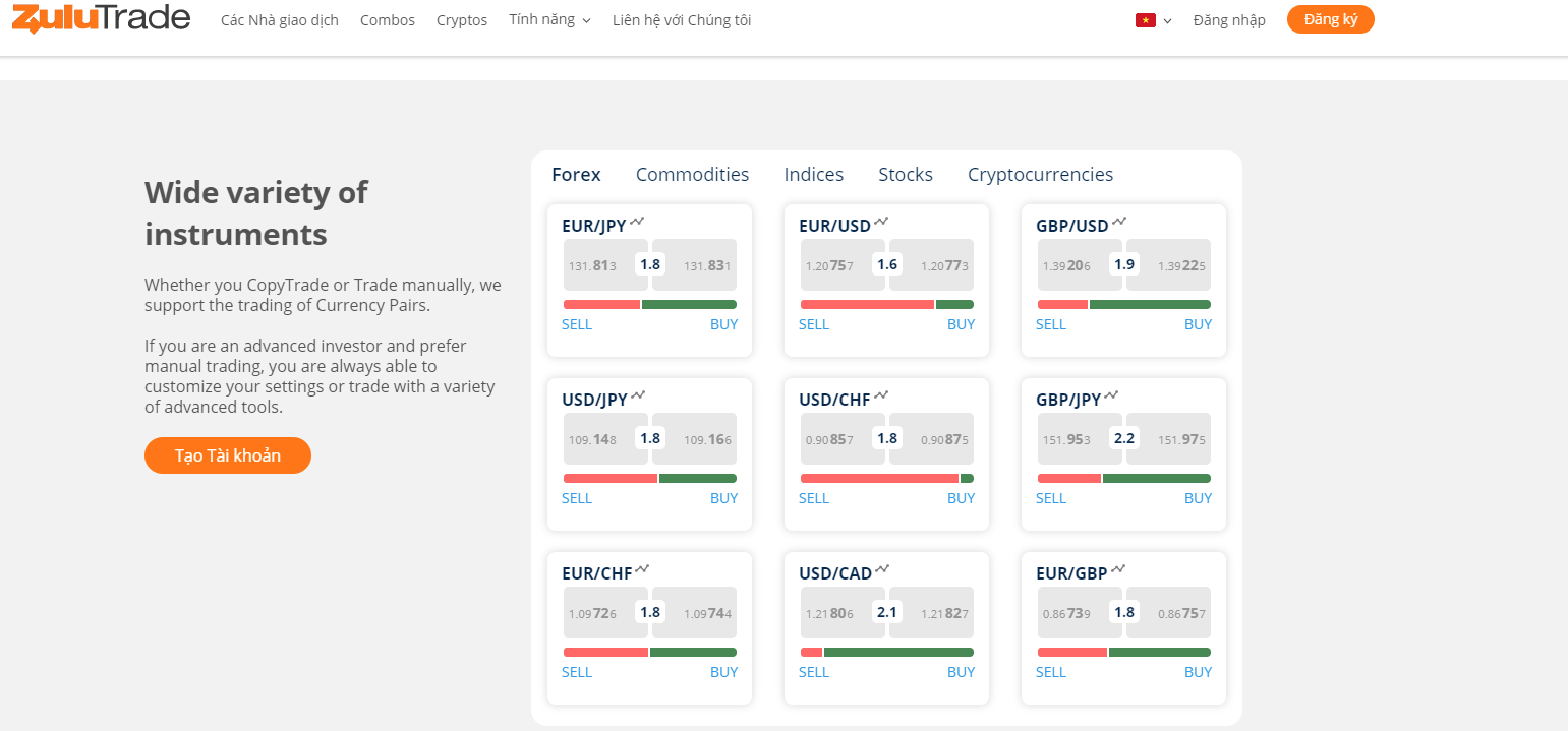 Những tài sản nào có thể giao dịch/Copy trader khác? (Nguồn: Zulutrade)