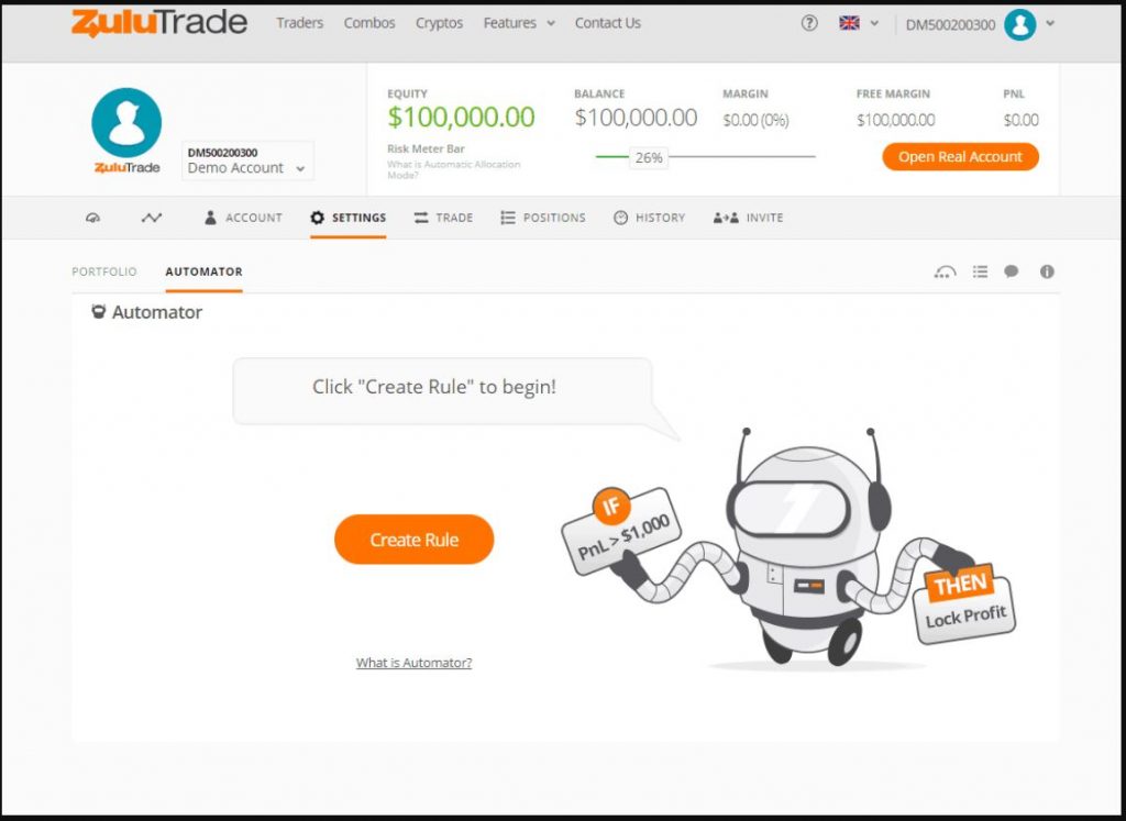 Trong số các tính năng sáng tạo nhất được cung cấp cho các trader là ZuluTrade có thể tự động hóa hoàn toàn quy trình giao dịch. Bất kỳ dịch vụ tín hiệu hoặc nền tảng giao dịch sao chép về cơ bản là bán tự động ngay từ đầu. Điều này là do thực tế là bạn đang tin tưởng vào giao dịch của người khác (tương tự như eToro). Zulutrade tiến thêm một bước với tính năng robot giao dịch tự động của họ.