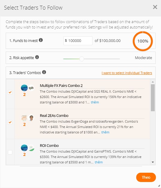 Bạn có thể tùy số tiền sẽ ủy thác (Funds to invest), khẩu vị rủi ro (Risk appetites), hay mức độ rủi ro thấp (Moderate). Tiếp đến bạn có thể chọn nhà cung cấp tín hiệu mà bạn sẽ theo dõi và giao dịch theo họ.