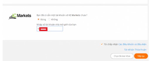 - Sau khi chọn broker để bắt đầu sao chép tín hiệu bạn cần phải nhập số tài khoản của bạn tại broker đã được chọn. Sau khi điền xong, bạn chọn “Tiếp tục”